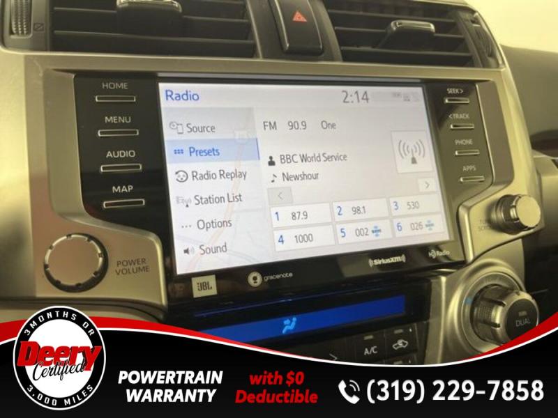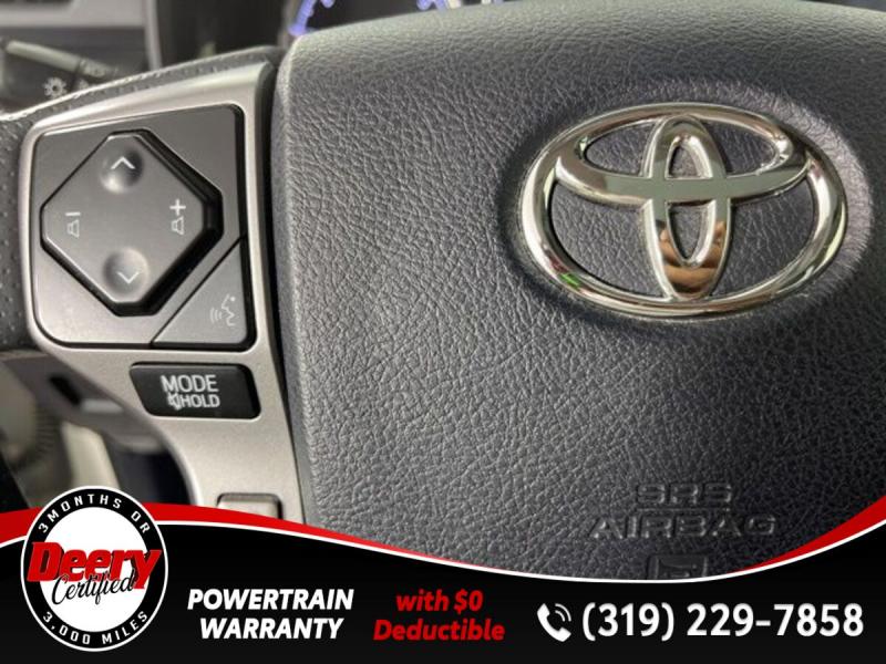 * TOYOTA GOLD CERTIFIED *, * ONE OWNER LOCAL TRADE *, * 4WD *, * LEATHER *, * HEATED/COOLED SEATS *, * NAVIGATION *, * SUNROOF/MOONROOF *, * BACK-UP CAMERA *, * BLIND SPOT MONITOR *, * APPLE CARPLAY *, * ANDROID AUTO *, * 2ND ROW BENCH SEAT *, * MEMORY SEATS *, * LOW MILES *, * JBL AUDIO *, * BLUETOOTH AUDIO/PHONE *, * ALLOY WHEELS *, * REAR PARK ASSIST *, * LANE DEPARTURE ALERT/ASSIST *, * TOYOTA SAFETY SENSE *, * RUNNING BOARDS *, * TOW HITCH RECEIVER *, * POWER SEAT *, * SIRIUS/XM RADIO *, * POWER WINDOWS *, * POWER DOOR LOCKS *, * CRUISE CONTROL *, * RADAR/ADAPTIVE CRUISE CONTROL *, * SMART KEY ENTRY *.Toyota Gold Certified Details: * Roadside Assistance for 7 Year / 100,000 Mile. Standard New-Car Financing Rates Available. Warranty honored at over 1,400 Toyota dealers in the continental U.S. & Canada. Trade-ins accepted. Trouble-free handling of your transaction, including DMV paperwork * 160 Point Inspection * Transferable Warranty * Powertrain Limited Warranty: 84 Month/100,000 Mile (whichever comes first) from TCUV purchase date * Vehicle History * Limited Warranty: 12 Month/12,000 Mile Limited Comprehensive Warranty: 12 Month/12,000 Mile (whichever comes first) from certified purchase date * Roadside Assistance * Warranty Deductible: $0Serving the Cedar Valley Area for 3 Generations as one of MIDWEST'S LARGEST DEALER GROUPS including Cedar Falls, Cedar Rapids, Dubuque, Iowa City, Des Moines, West Des Moines, Davenport, Clinton, Urbandale, Grimes, Marion, Marshalltown, Mason City, Fort Dodge, Ankeny, Waterloo, Ames, Burlington, Quad Cities, Waukee, Johnston & Muscatine.