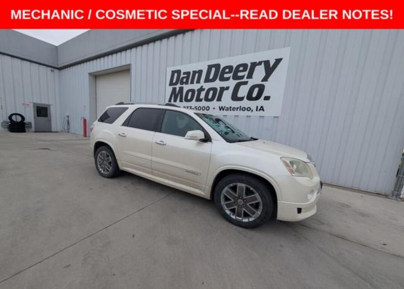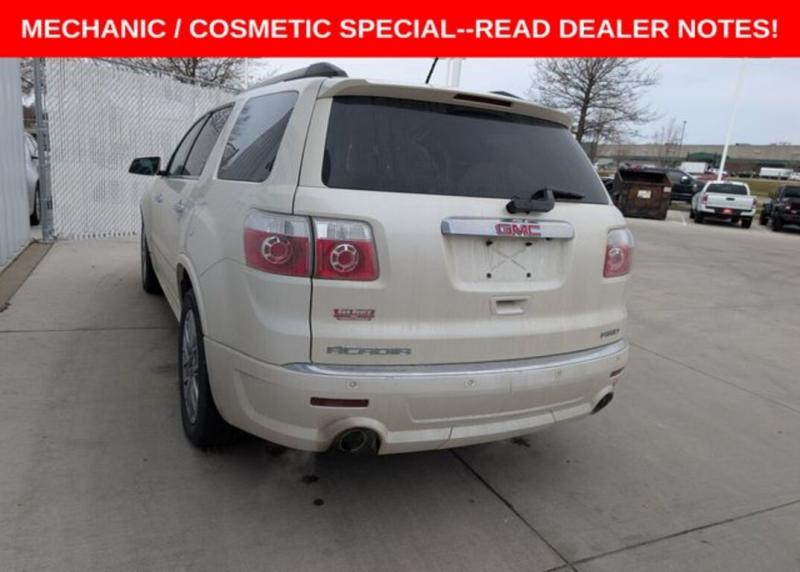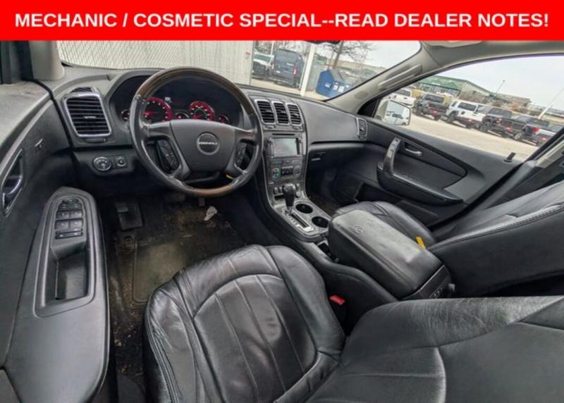 This Acadia is a local trade that is a priced as a ** MECHANIC / COSMETIC SPECIAL **. It does run and drive but has a cracked windshield and a few other concerns that come with the age and price range, but was driven as an everyday driver until traded.LOCAL TRADE, SUNROOF, DVD, HEATED / COOLED SEATS, NAVIGATION, LEATHER, ALL WHEEL DRIVE, ADAPTIVE CRUISE CONTROL, DUAL CLIMATE CONTROL, BUCKET SEATS, REMOTE START, POWER LIFTGATE, CRUISE CONTROL, POWER SEAT, POWER WINDOWS, POWER LOCKS, BACK-UP CAMERA, ALUMINUM/ALLOY WHEELS, MECHANIC / COSMETIC SPECIAL, PRICE REDUCED BASED ON CONDITION, CLEAN AUTOCHECK, VISIT [url] the Cedar Valley Area for 3 Generations as one of MIDWEST'S LARGEST DEALER GROUPS including Cedar Rapids, Dubuque, Iowa City, Des Moines, West Des Moines, Davenport, Clinton, Urbandale, Marion, Marshalltown, Mason City, Fort Dodge, Ankeny, Waterloo, Ames, Burlington, Quad Cities, Waukee, Johnston & Muscatine. Recent Arrival!Awards: * 2011 IIHS Top Safety Pick (built after 1/11)Reviews: * If you need lots of room to haul people and cargo but hate the look of a minivan, you'll like the 2011 GMC Acadia. It combines a large, usable interior and good gas mileage with attractive SUV-like exterior styling. Source: [url] * Compliant ride; seating for up to eight passengers; adult-friendly split-folding third-row seat; massive cargo area; top safety scores. Source: Edmunds