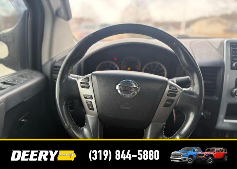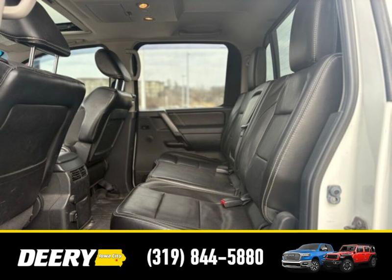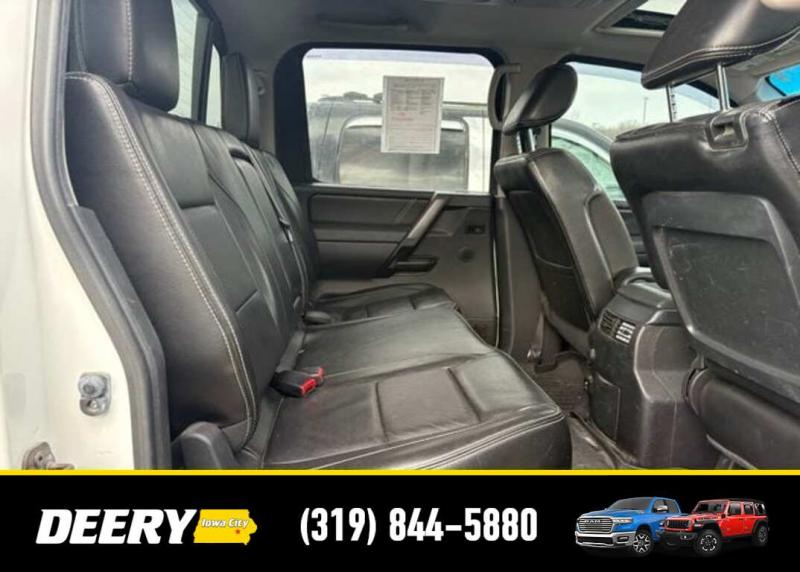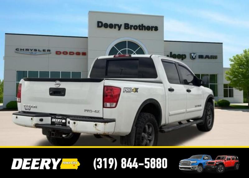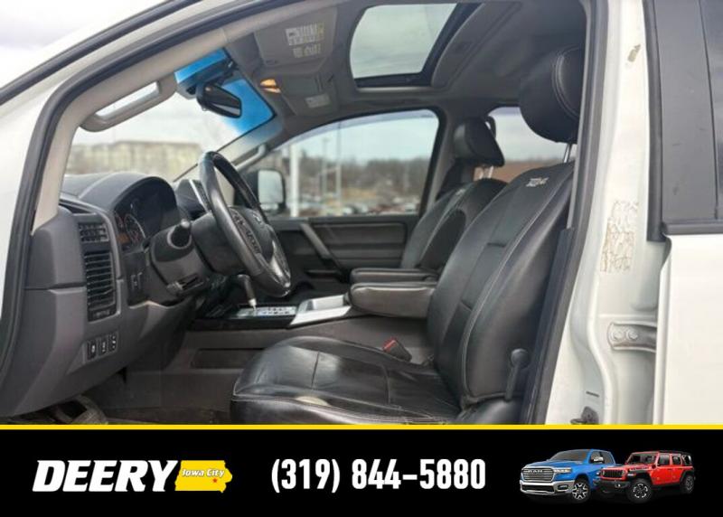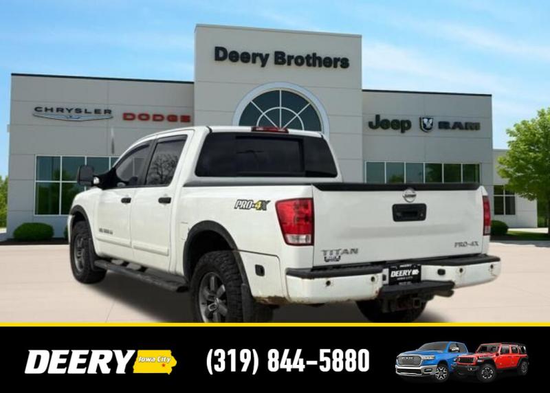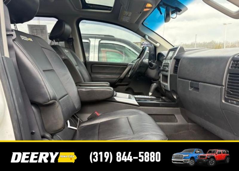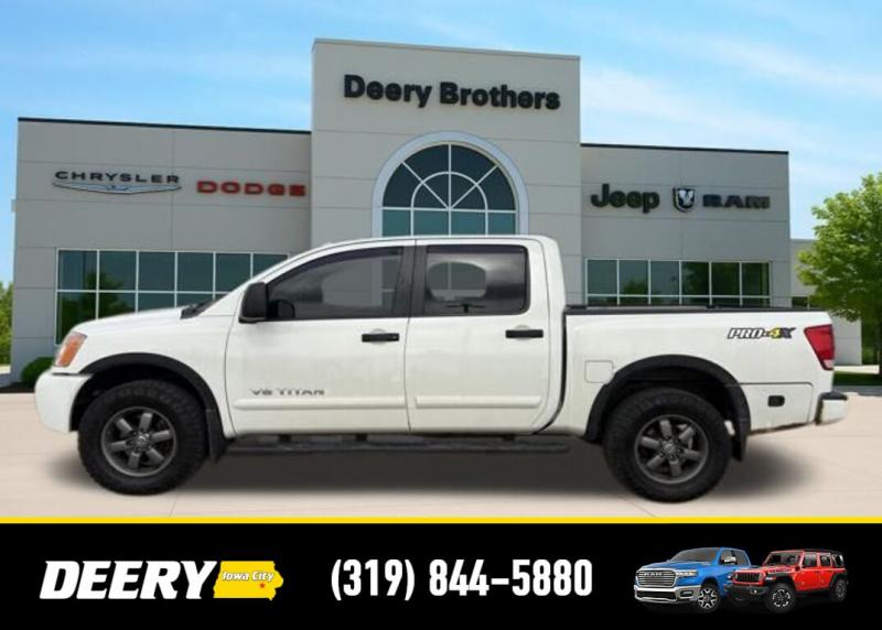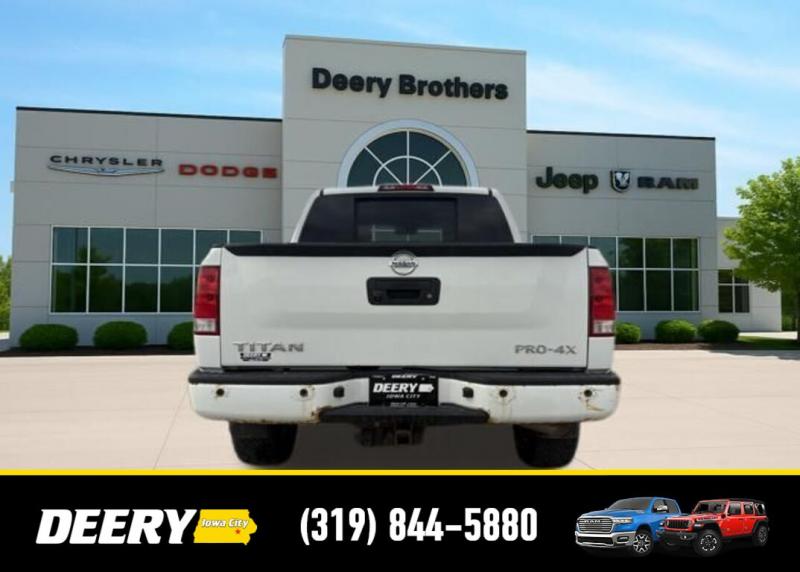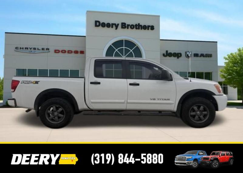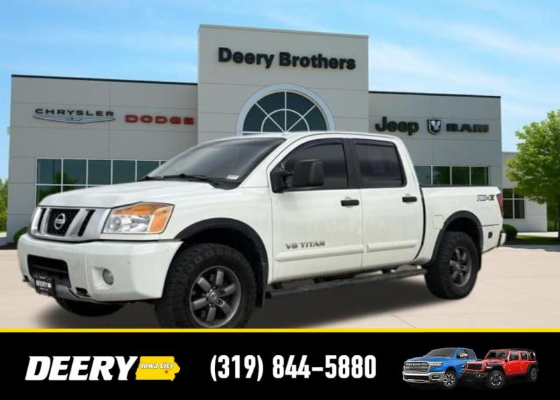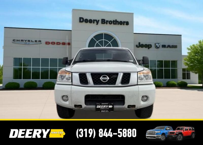 This Local Trade In has a Clean CARFAX and was traded in for a RAM Certified Pre-Owned RAM 1500! It is priced As Is No Warranty due to the age and exterior cosmetic condition with rust! ** Local Trade In, ** Clean CARFAX, ** As Is No Warranty, 120V Bed Outlet, ABS brakes, Alloy wheels, Compass, Electronic Stability Control, Factory Applied Spray-On Bedliner, Heated Dual Front Captain's Chairs, HomeLink Universal Transceiver, Illuminated entry, In-Cabin Microfilter, Leather-Appointed Seating Surfaces, Low tire pressure warning, Memory Outside Mirrors, Pedals Driver Seat, Moonroof, Navigation w/NissanConnect, Power Adjustable Pedals, Power Heated Extendable Tow Mirrors, PRO-4X Luxury Package, PRO-4X Moonroof Package, PRO-4X Premium Utility Package, Radio: Rockford Fosgate Premium Audio System, Rear Overhead Console, Remote keyless entry, Tailgate Area Illumination, Traction control, Utili-Track Channel System. Clean CARFAX. Odometer is 24787 miles below market average! Recent Arrival! White 2014 Nissan Titan PRO-4X 4D Crew Cab 5.6L 8-Cylinder SMPI DOHC 12/17 City/Highway MPG 5-Speed Automatic 4WD Serving Iowa City, Cedar Rapids, Waterloo, North Liberty, Davenport, Muscatine, Quad Cities, Des Moines, Keokuk, Mount Pleasant, Washington, and Dubuque. Don't miss out! Give us a call at [phone] to confirm availability and schedule a test-drive.